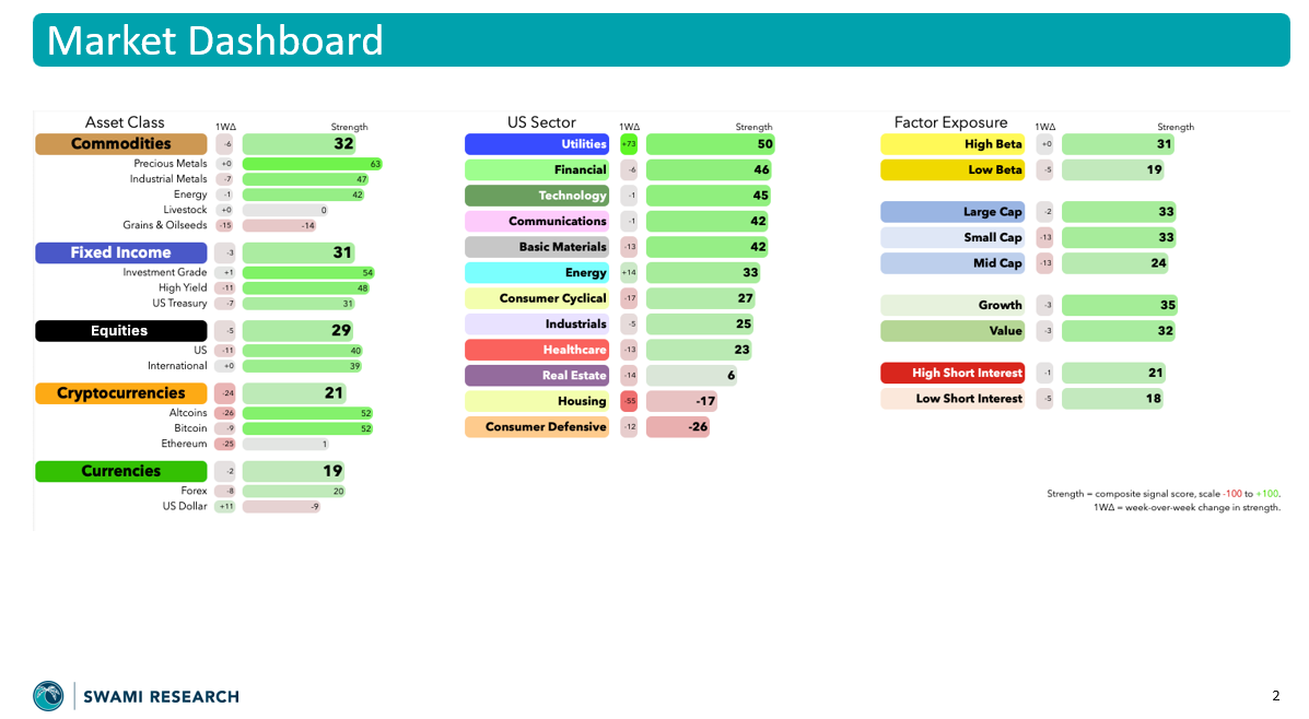 Last week’s themes largely carried over — bonds (TLT) continue to firm above trend, commodities like DBA/USO are still holding bullish, and Bitcoin stays constructive inside its uptrend. The big change? The dollar (DXY) has started to strengthen, shifting from last week’s bearish tone to something we now need to watch more closely. Equities are still pushing higher, with energy (XLE) bouncing, though our Add levels remain untouched.