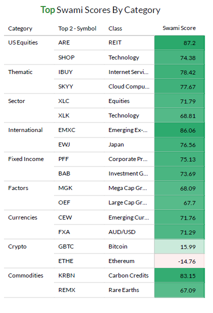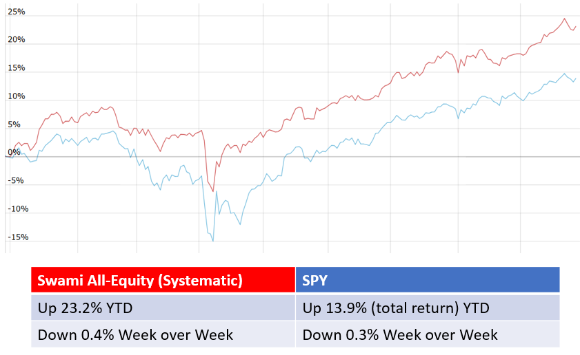 Performance of the Swami All-Equity portfolio remains robust, even as our portfolio declined 0.3% last week (vs SPY -0.2%). Our YTD performance is +23.2% versus 13.9% for SPY, as of Friday's close. The portfolio is rebalanced each Friday at market close to reflect the top exposures within the SECTORS, FACTOR, and THEMATIC ETFs we track, as well as within the top ASSET HEAVY and ASSET LIGHT Individual Equities we send out in the Daily ETF Report. Many of last weeks "top signals" remain in the portfolio: XLE (SPDR Energy Sector ETF) is going to its 4th straight week as a top signal (and was the top performing SECTOR ETF at last week at +4.8% vs SPY -0.3%) while JPM (JP Morgan Chase) is going into it's 5th straight week as a top signal as a "Asset Heavy" Individual MegaCap we signal on.